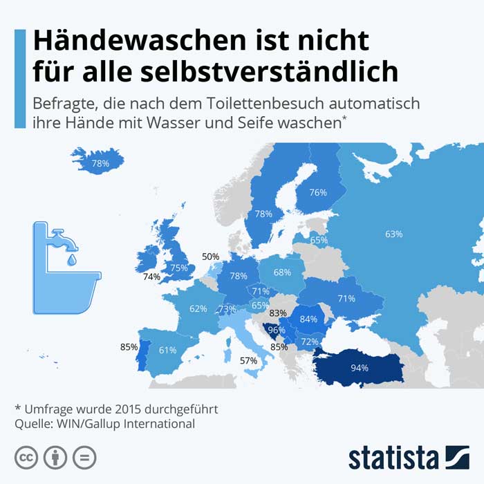 Übrigens, was die Hygiene betrifft, ist Händewaschen bei uns Deutschen längst nicht selbstverständlich. Dabei kann gründliches Händewaschen das Ausbreiten von Keimen deutlich reduzieren und wäre gerade jetzt wichtig angesichts der Corona-Virus-Pandemie. Die Grafik von Statista zeigt, wie blauäugig wir hierzulande beim Thema Händewaschen sind. Übrigens, was es dabei zu beachten gilt beziehungsweise welche Fehler vermieden werden sollten, zeigen ein Video von t-online.