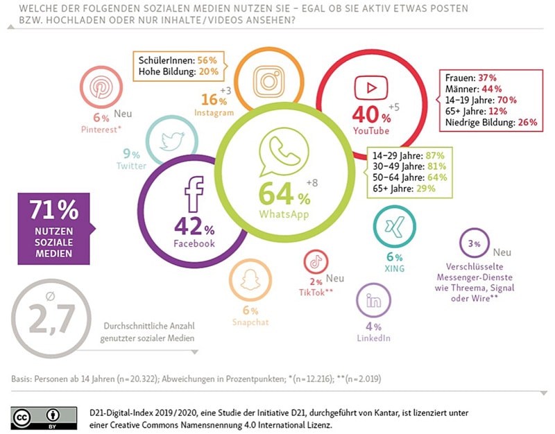 Immerhin nutzen 71 Prozent der Onliner Social Media – und dazu gehören neben Facebook vor allem Whatsapp, Instagram, Youtube, Twitter, Pinterest und Xing. Erstaunlich dabei ist, welche Rolle Whatsapp spielt. Annähernd zwei Drittel nutzen Whatsapp, darunter 64 Prozent der 50 bis 65-Jährigen und 29 Prozent der 65plus-Generation. Vielen ist offensichtlich egal, dass es bei Whatsapp Datenschutzprobleme gibt.