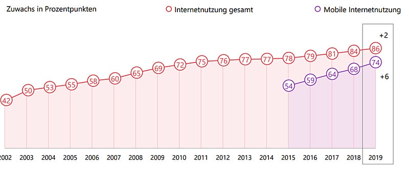 Die Internetnutzung ist stetig gestiegen. Noch stärker fiel der Zuwachs bei der mobilen Internetnutzung aus