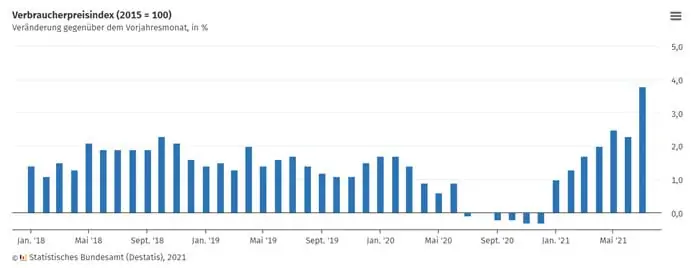 Für Rentner im Westen kommt es 2021 knüppeldick – die Rentenerhöhung blieb aus, dafür beginnt die Inflation an, zu traben. Die Inflationsrate in Deutschland – gemessen als Veränderung des Verbraucherpreisindex (VPI) zum Vorjahresmonat – wird im September 2021 dem Statistischen Bundesamt zufolge voraussichtlich +4,1 Prozent betragen. Dabei stiegen die Preise im August bereits um 3,9 Prozent im Vergleich zum Vorjahresmonat. Der Preisauftrieb verstetig sich also – und das dürfte noch nicht das Ende sein.